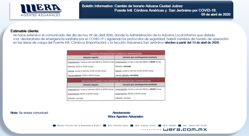 RECORDATORIO // Fwd: IMPORTANTE // CAMBIO DE HORARIO ADUANA LOCAL DE JUAREZ // ABRIL 13 2020 // COVID