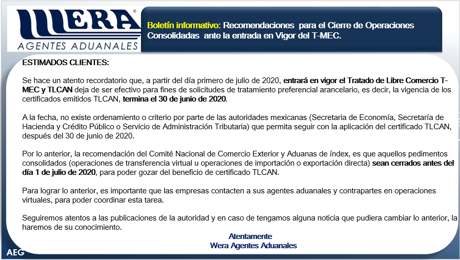 Boletín informativo: Recomendaciones para el Cierre de Operaciones Consolidadas ante la entrada en Vigor del T-MEC.